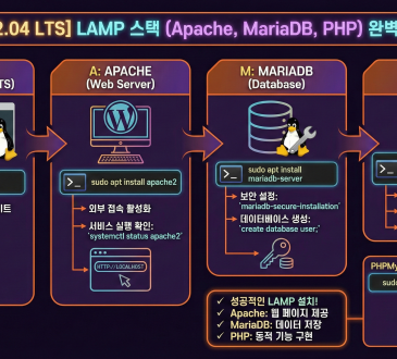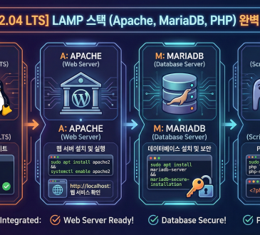 LinuxTechnology[Ubuntu 22.04 LTS] LAMP 스택 (Apache, MariaDB, PHP) 완벽 설치 가이드amond3 weeks ago2025-12-1911요청하신 LinuxBabe의 Ubuntu 22.04 LAMP Stack (Linux, Apache, MariaDB, PHP) 설치 가이드를 정리했습니다. LAMP 스택은 웹 서버 구축의 가장 기본이자...