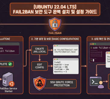 Latest PostLinuxTechnology[Ubuntu 22.04 LTS] Fail2Ban 보안 도구 완벽 설치 및 설정 가이드amond3 weeks ago2025-12-1915Fail2Ban은 서버 로그를 실시간으로 감시하여 비밀번호 무차별 대입 공격(Brute-force Attack)을 시도하는 악성 IP를 자동으로 차단해 주는 필수 보안 도구입니다. 복사-붙여넣기만으로...