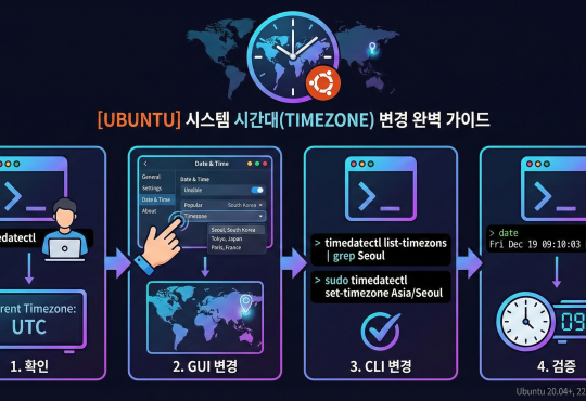 LinuxTechnology[Ubuntu] 시스템 시간대(Timezone) 변경 완벽 가이드amond3 weeks ago2025-12-19150. 환경 명시 OS 버전: Ubuntu 18.04.4 LTS (Ubuntu 20.04/22.04 LTS 공통 적용 가능) 권한: sudo 권한이 있는 일반 사용자...